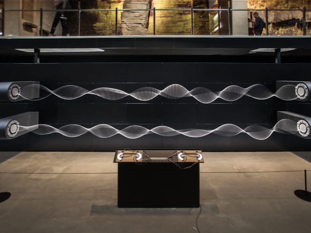 The installation reacts to those who watch it. When the audience moves around it they influence the movements of the rope, generating visual and acoustic waves from harmonic patterns to complex ones.