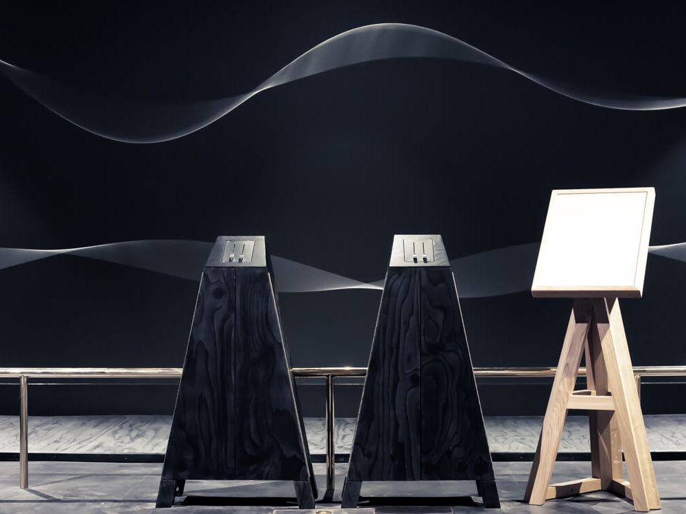 Depending on how we may act in front of it, according to the number of observers and their movements, it will pass from a steady line without sound to chaotic shapes of irregular sounds (the more movement there is around the installation) through the different phases of sinusoidal waves and harmonic sounds; examining the action-reaction principle applied to sound and space.